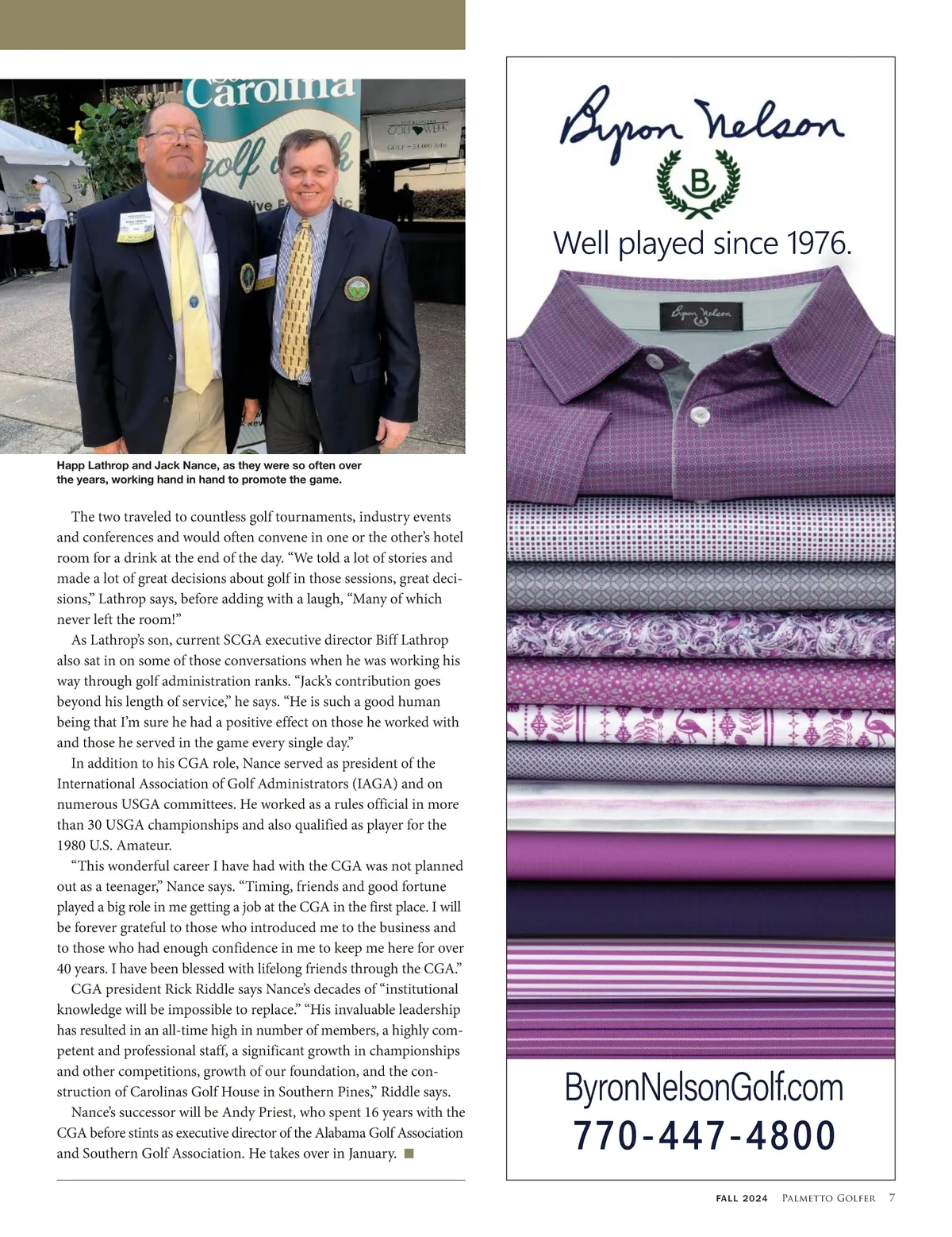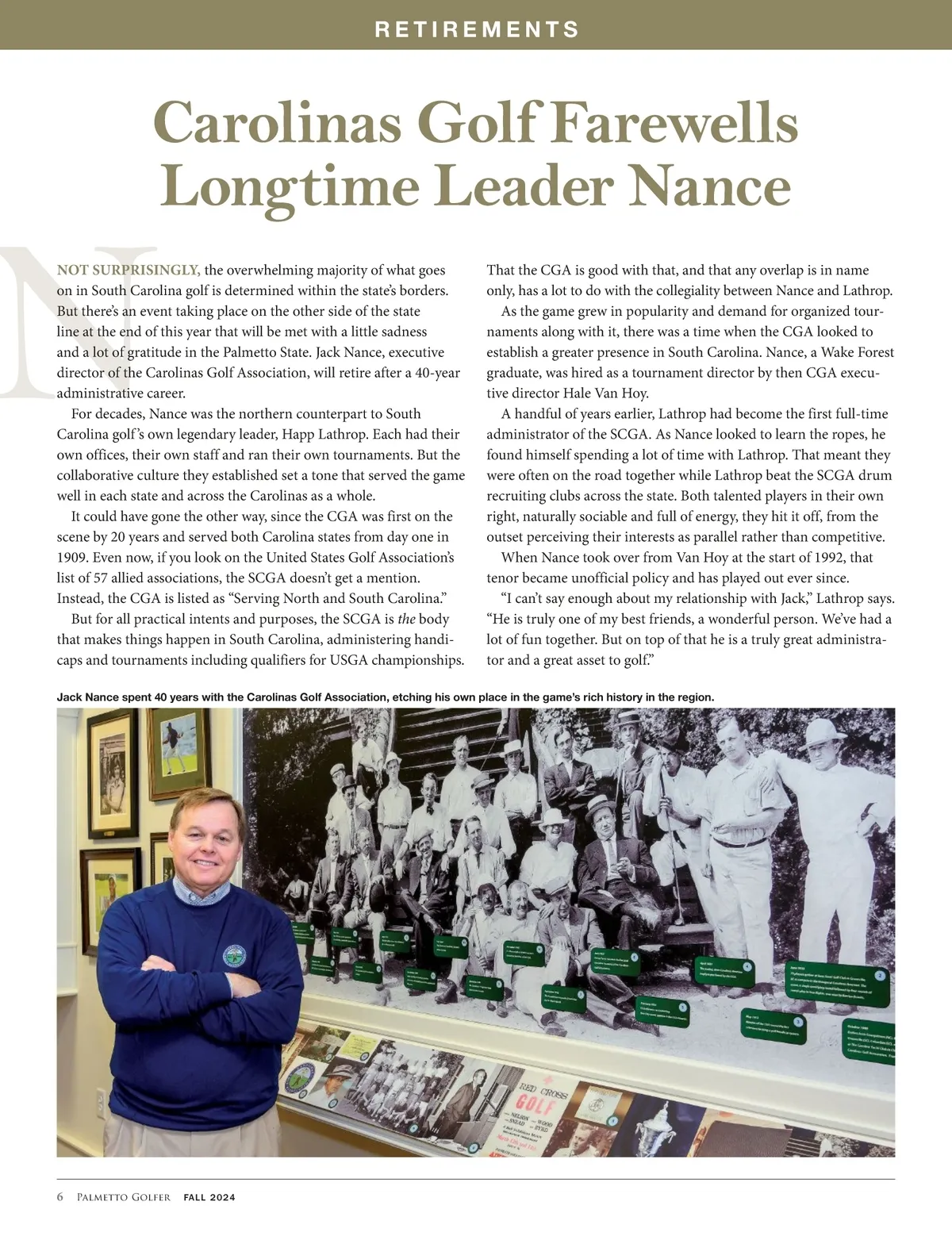 RETIREMENTS Carolinas Golf Farewells Longtime Leader Nance NOT SURPRISINGLY, the overwhelming majority of what goes on in South Carolina golf is determined within the state’s borders. But there’s an event taking place on the other side of the state line at the end of this year that will be met with a little sadness and a lot of gratitude in the Palmetto State. Jack Nance, executive director of the Carolinas Golf Association, will retire after a 40-year administrative career. For decades, Nance was the northern counterpart to South Carolina golf ’s own legendary leader, Happ Lathrop. Each had their own offices, their own staff and ran their own tournaments. But the collaborative culture they established set a tone that served the game well in each state and across the Carolinas as a whole. It could have gone the other way, since the CGA was first on the scene by 20 years and served both Carolina states from day one in 1909. Even now, if you look on the United States Golf Association’s list of 57 allied associations, the SCGA doesn’t get a mention. Instead, the CGA is listed as “Serving North and South Carolina.” But for all practical intents and purposes, the SCGA is the body that makes things happen in South Carolina, administering handi-caps and tournaments including qualifiers for USGA championships. That the CGA is good with that, and that any overlap is in name only, has a lot to do with the collegiality between Nance and Lathrop. As the game grew in popularity and demand for organized tour-naments along with it, there was a time when the CGA looked to establish a greater presence in South Carolina. Nance, a Wake Forest graduate, was hired as a tournament director by then CGA execu-tive director Hale Van Hoy. A handful of years earlier, Lathrop had become the first full-time administrator of the SCGA. As Nance looked to learn the ropes, he found himself spending a lot of time with Lathrop. That meant they were often on the road together while Lathrop beat the SCGA drum recruiting clubs across the state. Both talented players in their own right, naturally sociable and full of energy, they hit it off, from the outset perceiving their interests as parallel rather than competitive. When Nance took over from Van Hoy at the start of 1992, that tenor became unofficial policy and has played out ever since. “I can’t say enough about my relationship with Jack,” Lathrop says. “He is truly one of my best friends, a wonderful person. We’ve had a lot of fun together. But on top of that he is a truly great administra-tor and a great asset to golf.” N Jack Nance spent 40 years with the Carolinas Golf Association, etching his own place in the game’s rich history in the region. 6 Palmetto Golfer FALL 2024