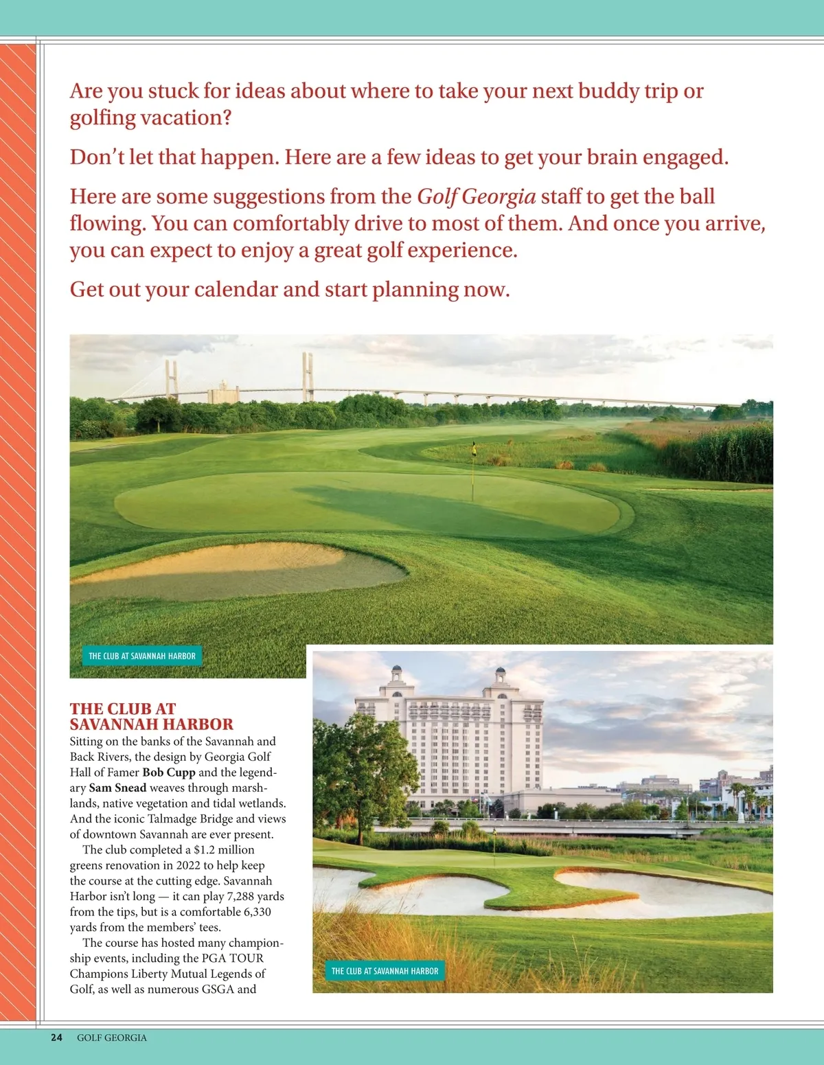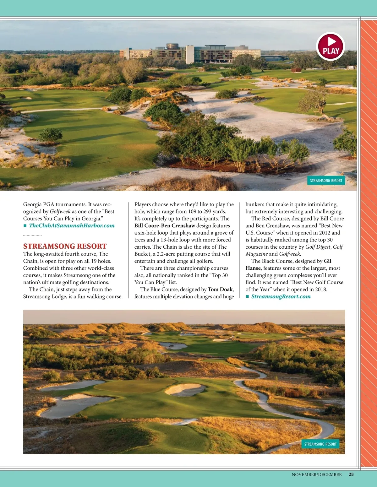 STREAMSONG RESORT Georgia PGA tournaments. It was rec-ognized by Golfweek as one of the “Best Courses You Can Play in Georgia.” ■ TheClubAtSavannahHarbor.com STREAMSONG RESORT The long-awaited fourth course, The Chain, is open for play on all 19 holes. Combined with three other world-class courses, it makes Streamsong one of the nation’s ultimate golfing destinations. The Chain, just steps away from the Streamsong Lodge, is a fun walking course. Players choose where they’d like to play the hole, which range from 109 to 293 yards. It’s completely up to the participants. The Bill Coore -Ben Crenshaw design features a six-hole loop that plays around a grove of trees and a 13-hole loop with more forced carries. The Chain is also the site of The Bucket, a 2.2-acre putting course that will entertain and challenge all golfers. There are three championship courses also, all nationally ranked in the “Top 30 You Can Play” list. The Blue Course, designed by Tom Doak , features multiple elevation changes and huge bunkers that make it quite intimidating, but extremely interesting and challenging. The Red Course, designed by Bill Coore and Ben Crenshaw, was named “Best New U.S. Course” when it opened in 2012 and is habitually ranked among the top 30 courses in the country by Golf Digest , Golf Magazine and Golfweek . The Black Course, designed by Gil Hanse , features some of the largest, most challenging green complexes you’ll ever find. It was named “Best New Golf Course of the Year” when it opened in 2018. ■ StreamsongResort.com STREAMSONG RESORT NOVEMBER/DECEMBER 25